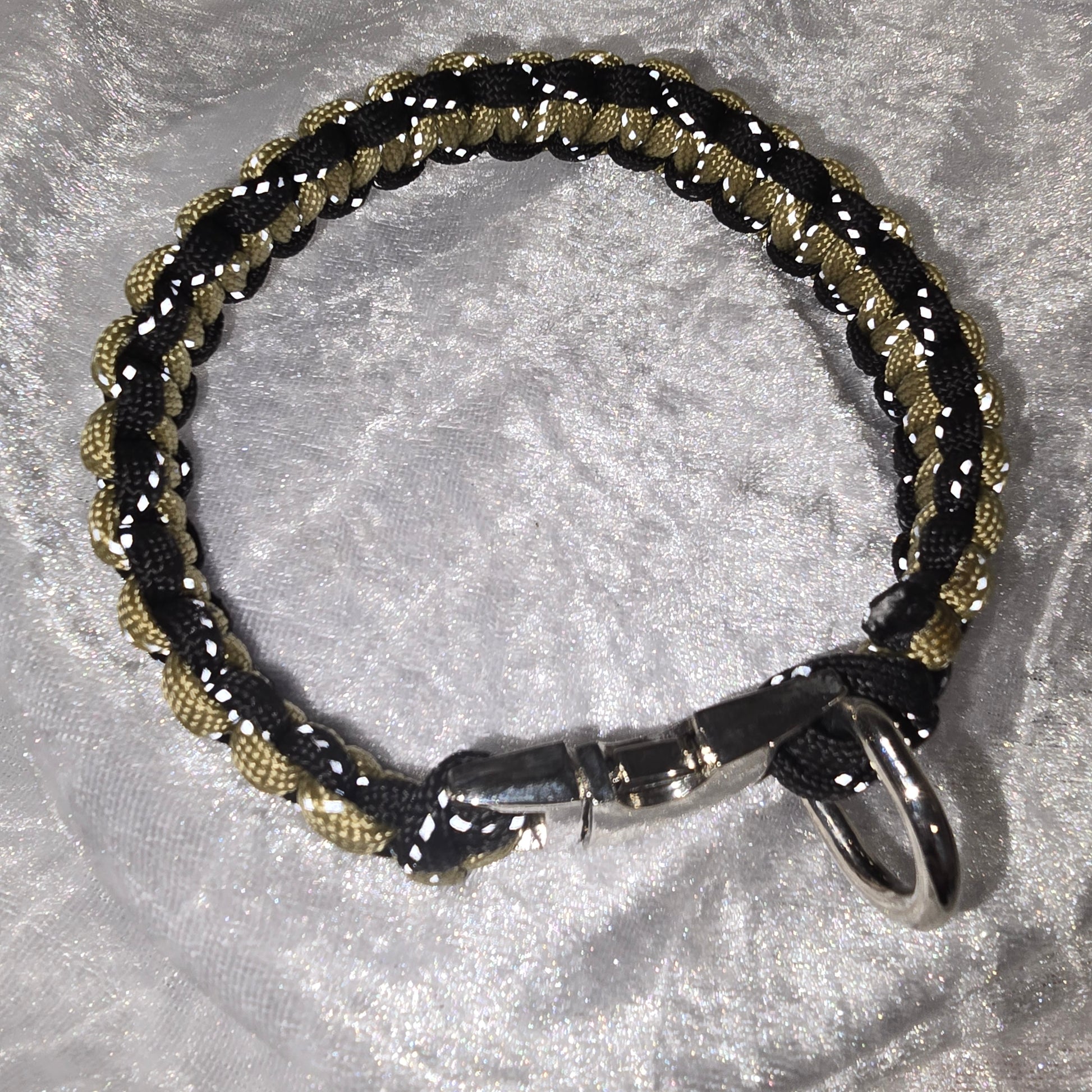 High quality paracord reflective Dog Collar made from 4mm Paracord. This collar is made with Cobra Weave with a Stainless Steel welded D Ring and an appropriate clasp. the inside circumference is 27cm please allow room for your dog as these collars are not adjustable.